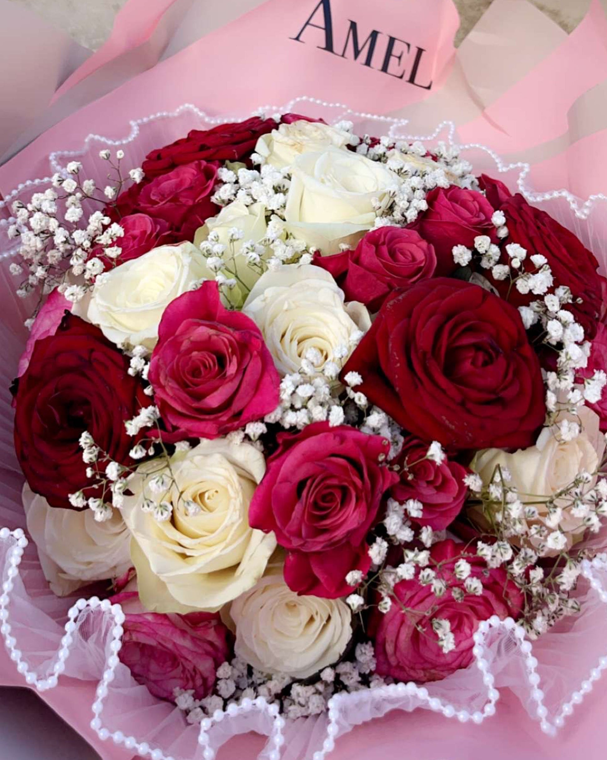 Composé d'environ 50 roses dont 7 roses rouge premium et d'un mélange de roses blanches et d'un dégradé de roses roses et de gypsophiles blanches.