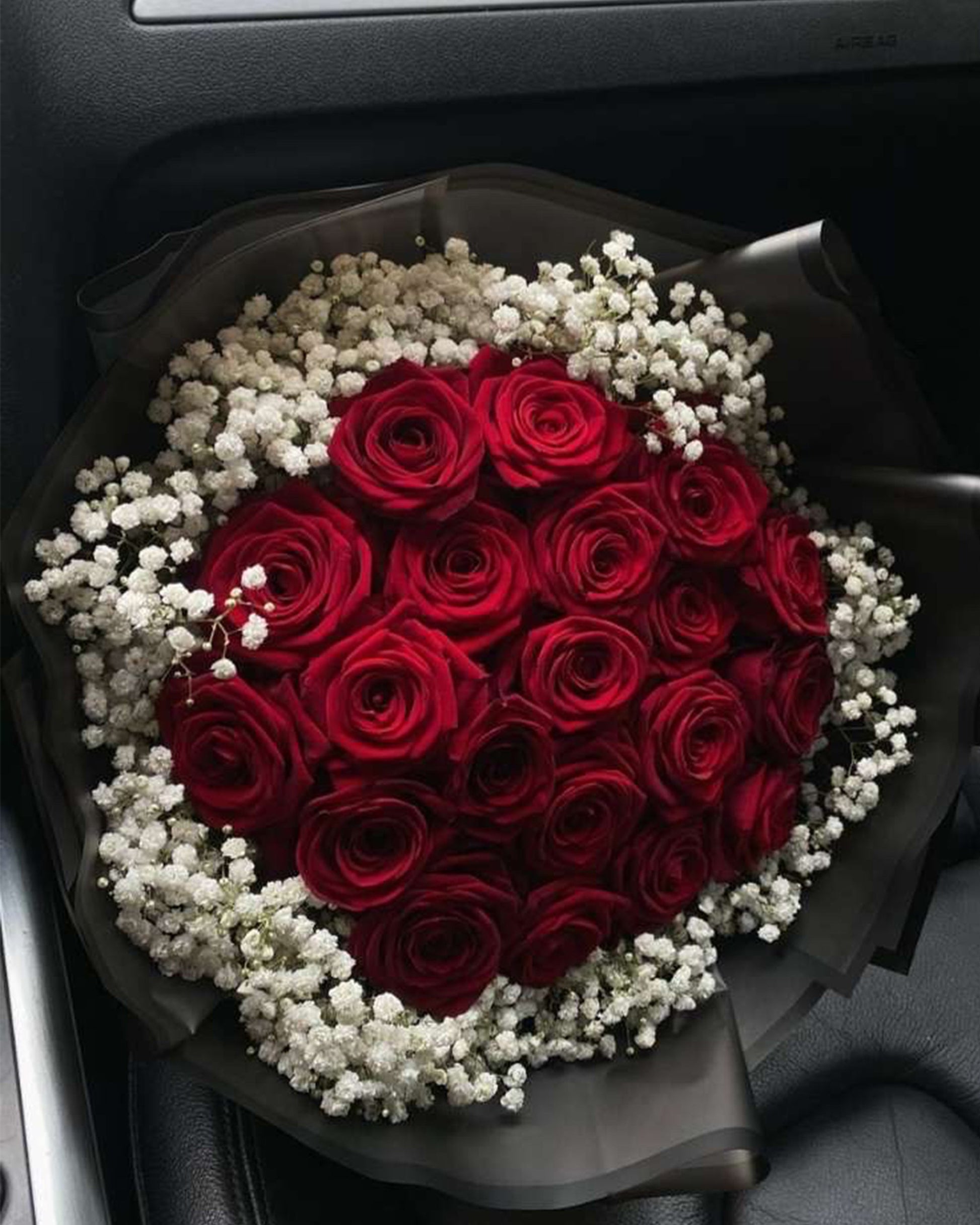 Composé de 20 roses rouge entourées de gypsophiles blanches.