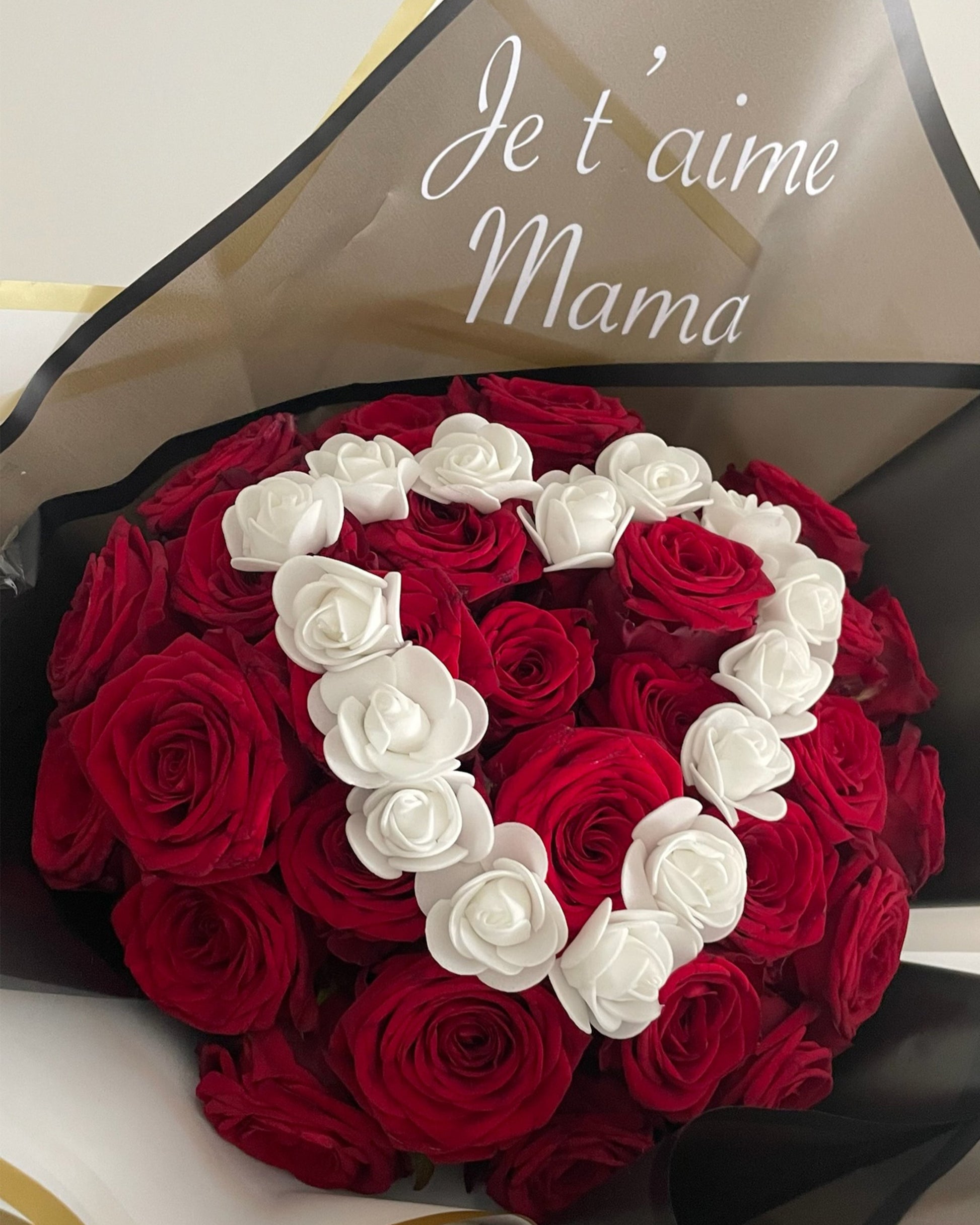 Composé de 30 roses rouges avec un coeur de 15 roses blanches au milieu.