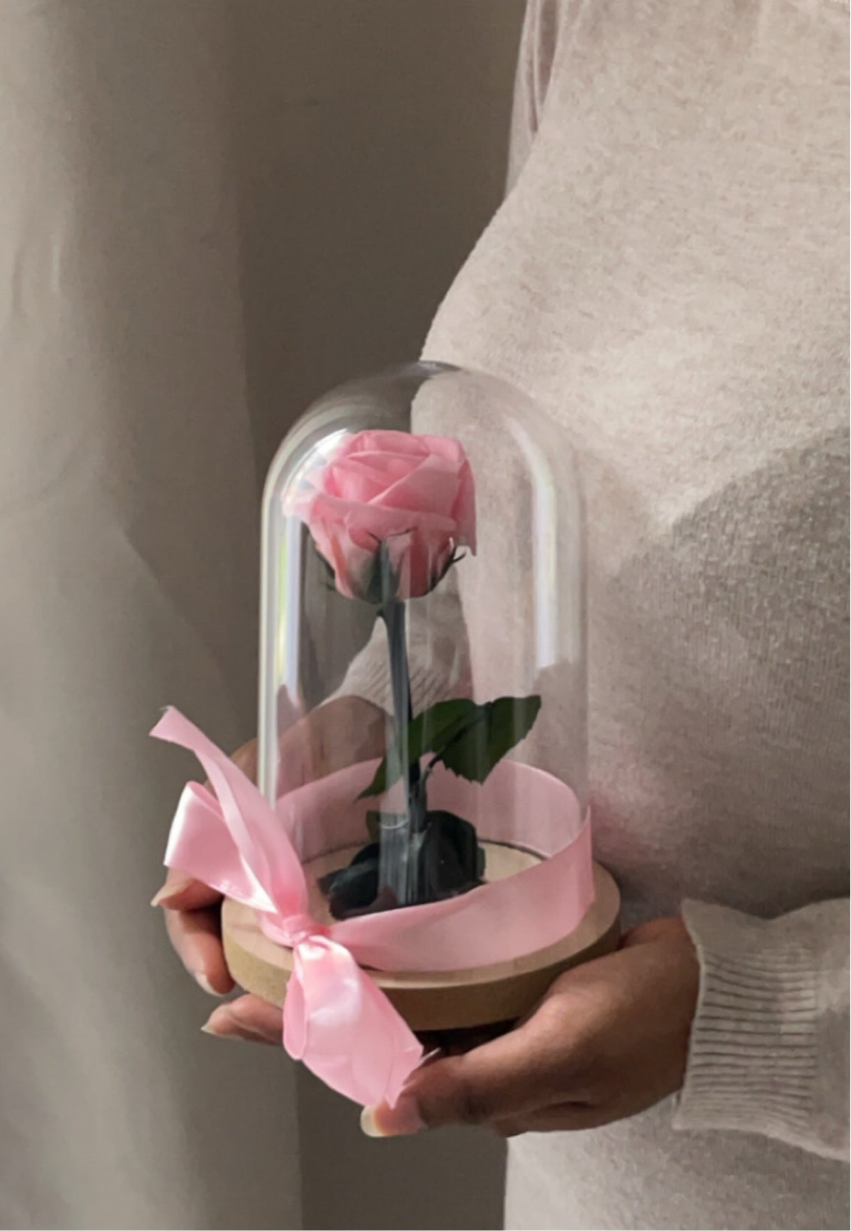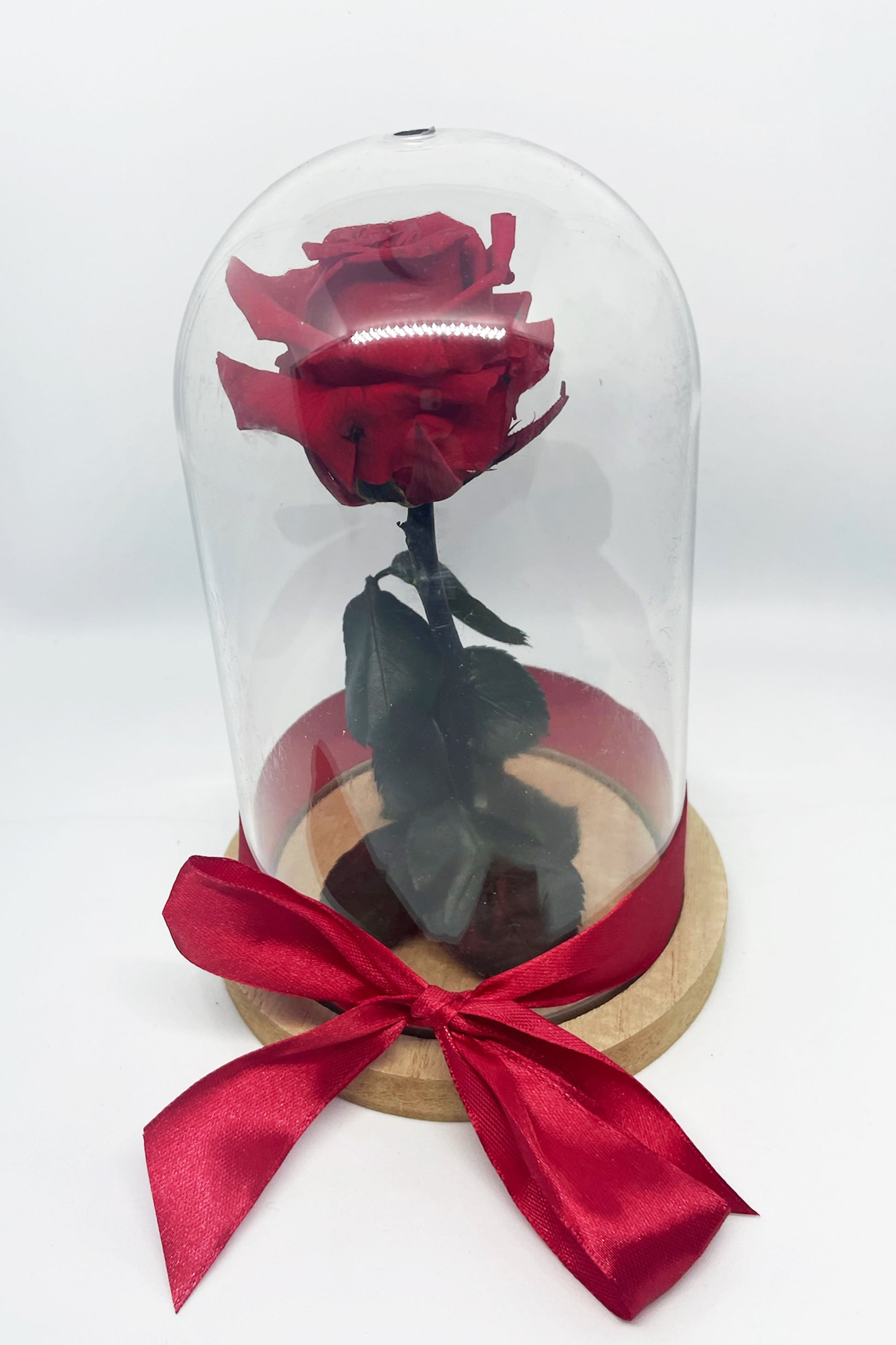 Cloche en verre de 21cm, entourĂ©e d'un ruban assorti Ă la couleur de la rose.Â